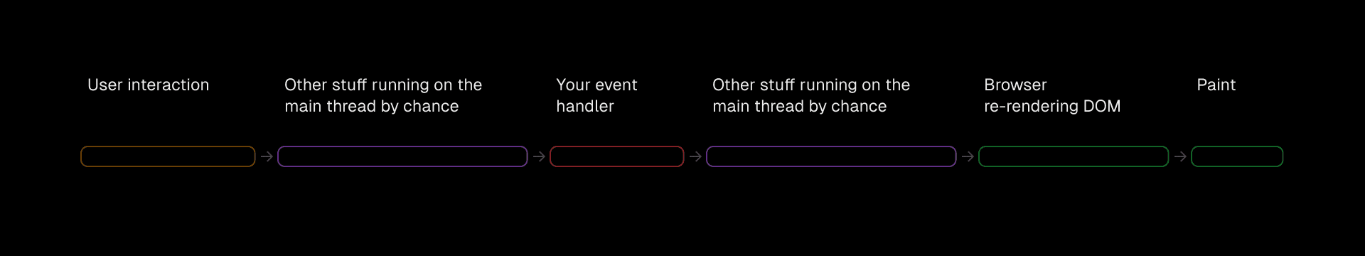 export function interactionResponse(): Promise<unknown> { return new Promise((resolve) => { setTimeout(resolve, 100); // Fallback for the case where the animation frame never fires. requestAnimationFrame(() => { setTimeout(resolve, 0); }); });}The code waits for an animation frame, but then also for a timeout. This allows the browser to paint the frame, and then immediately run the code. There is a backup timeout for the special case where the animation frame never runs, which is only relevant for extreme cases like the user moving to a different tab at just the right instant.