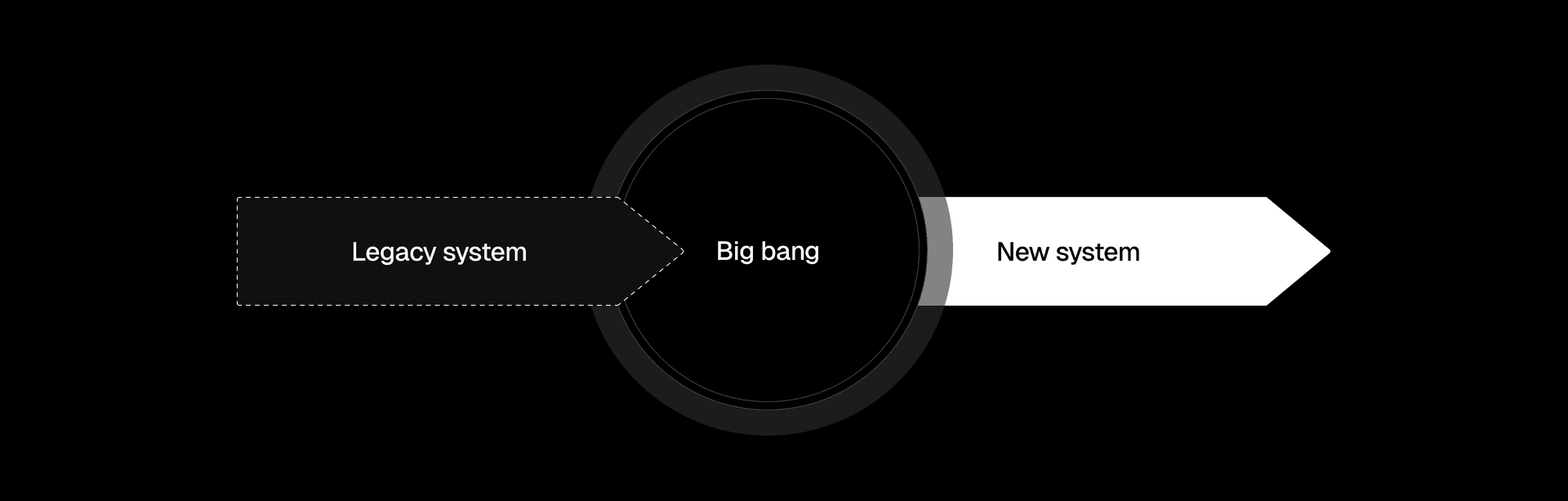 Big bang migrations are migrations in which a system is replaced in a one-time full switchover. There may be intermediate steps, but they are all performed in very short order. Basically, you pick a date, and on that date, all usage is moved from the legacy system to the new system.