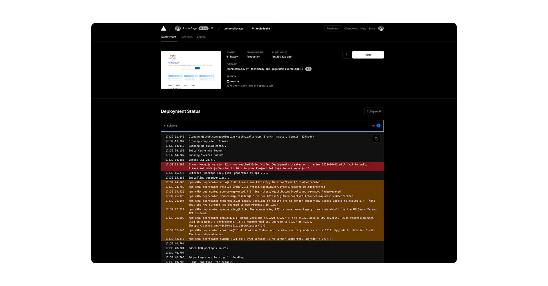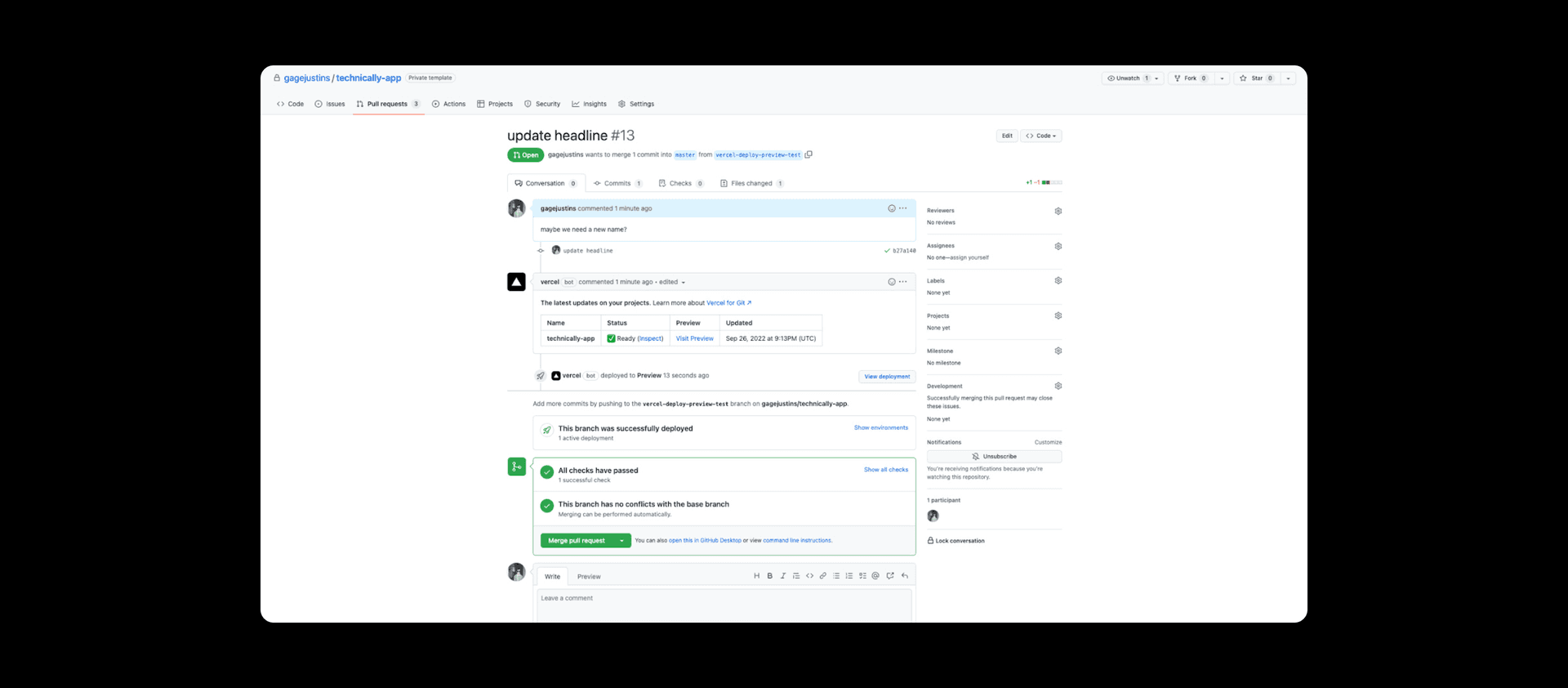 Another really nice feature is deploy previews. When you open a new pull request with changes to your frontend codebase that you’re considering merging / applying, Vercel automatically tries to deploy that code on a new server so you can see how it looks before agreeing to apply those changes. I’m considering a name change for Technically (not really) so I’ve opened up a PR to change the name on the site: