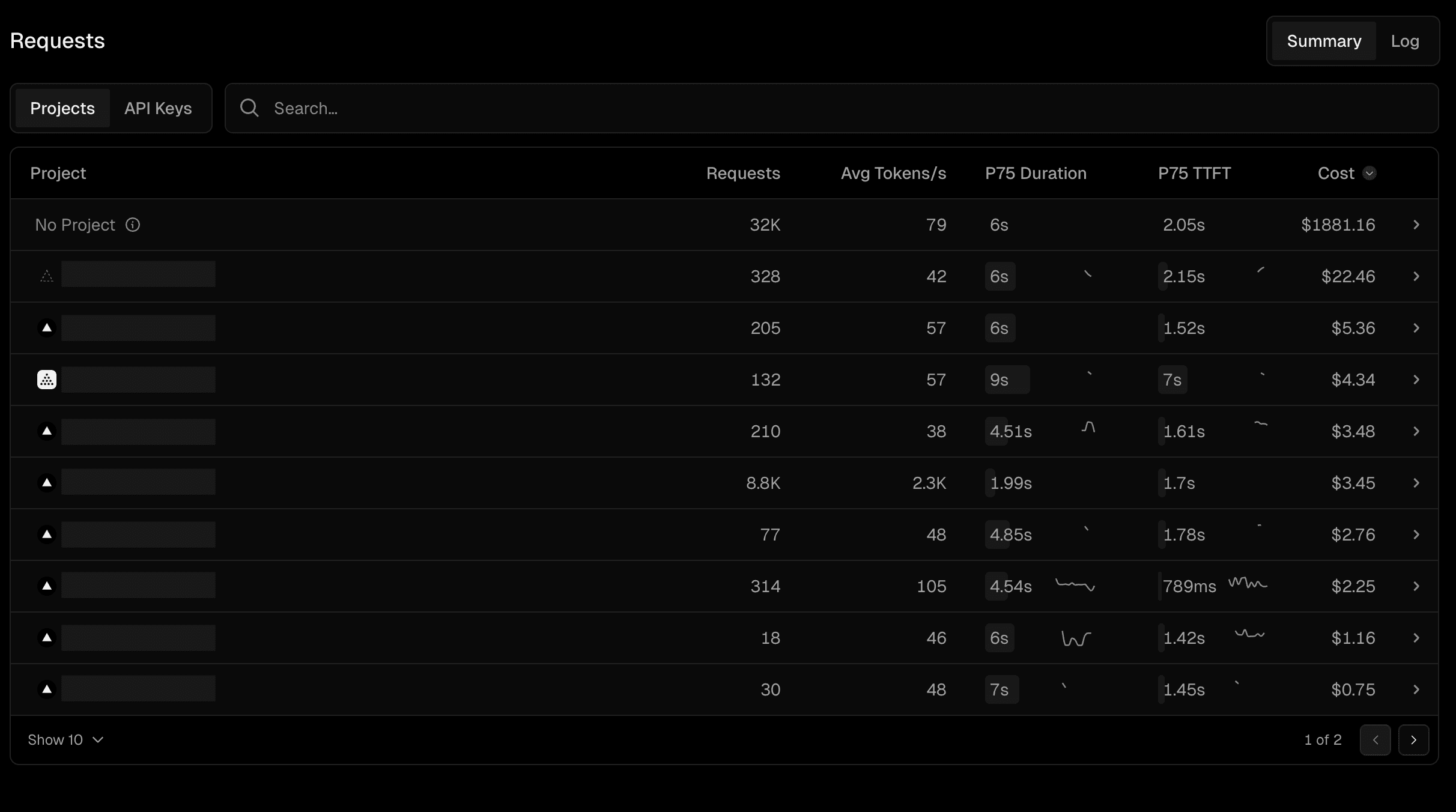 - Requests: Summaries by project, API key, and a detailed log of all requests