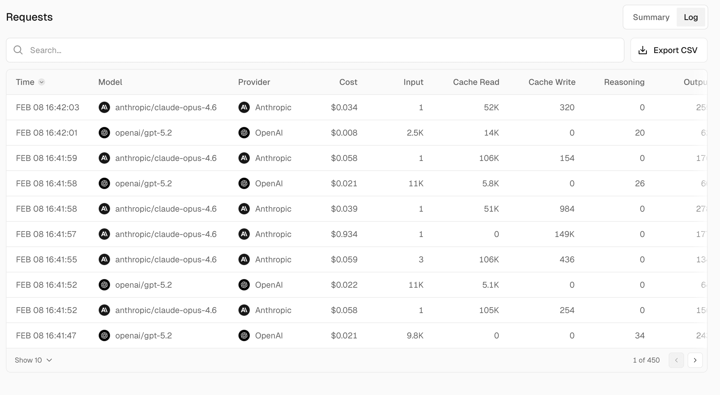 View a detailed log of all requests made to the AI Gateway, including all token types and the cost for each request. You can sort or export the logs for the selected time frame.