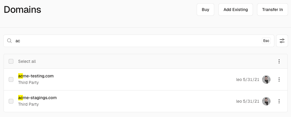 To view all your registered domains, go to the Domains tab in your Vercel dashboard.
