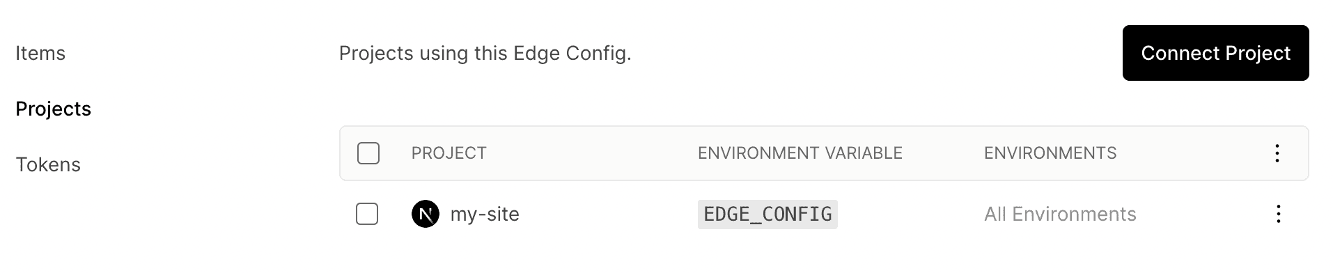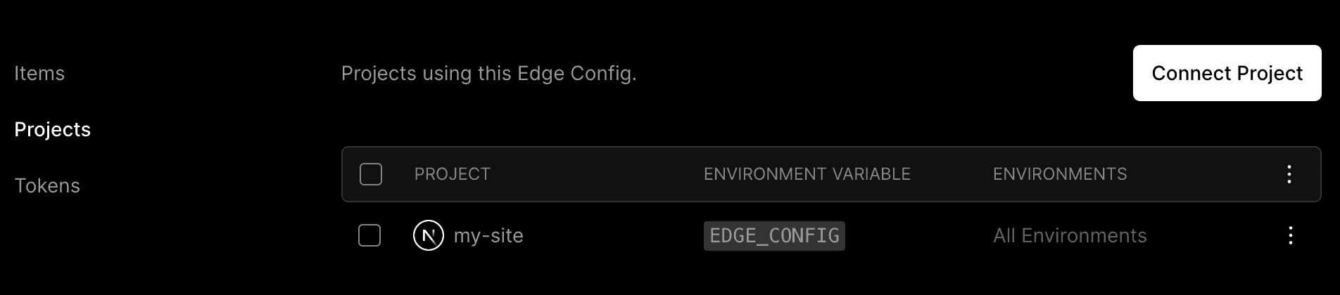 EDGE_CONFIGthat holds a connection string. If you go to your projects's Settings > Environment Variables, you'll see the newly created environment variable. - A read access token. This token, along with your EDGE CONFIG ID is used to create a connection string. This connection string is saved as the value of your