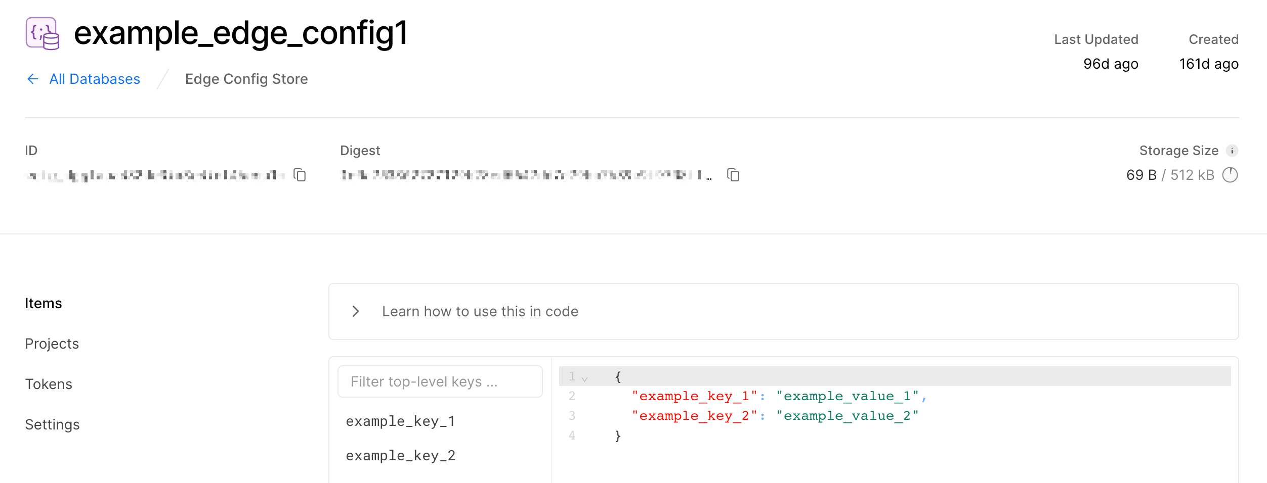 The default view of the Edge Config's detail page shows the list of all items in the store. You will see an open accordion titled Learn how to use this in code if the Edge Config is connected to at least one project. This accordion provides the steps with a code example on how to read your store items.
