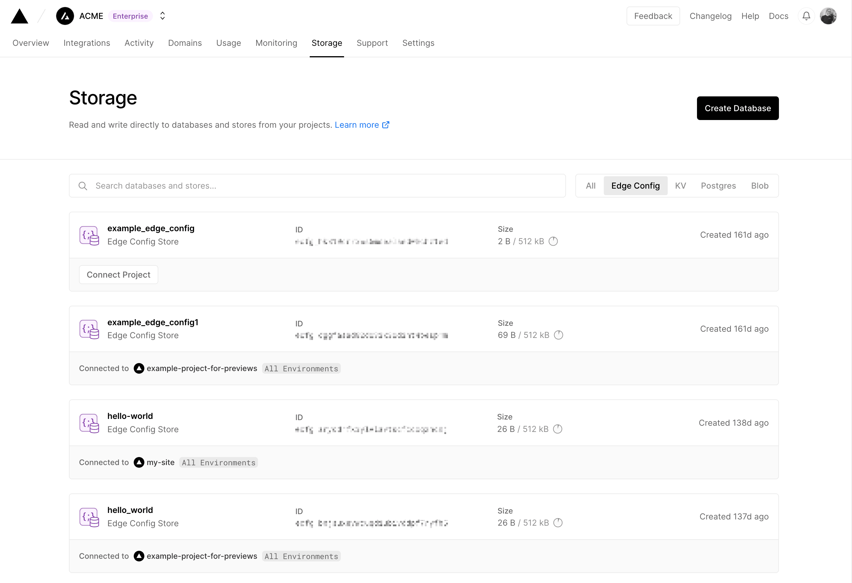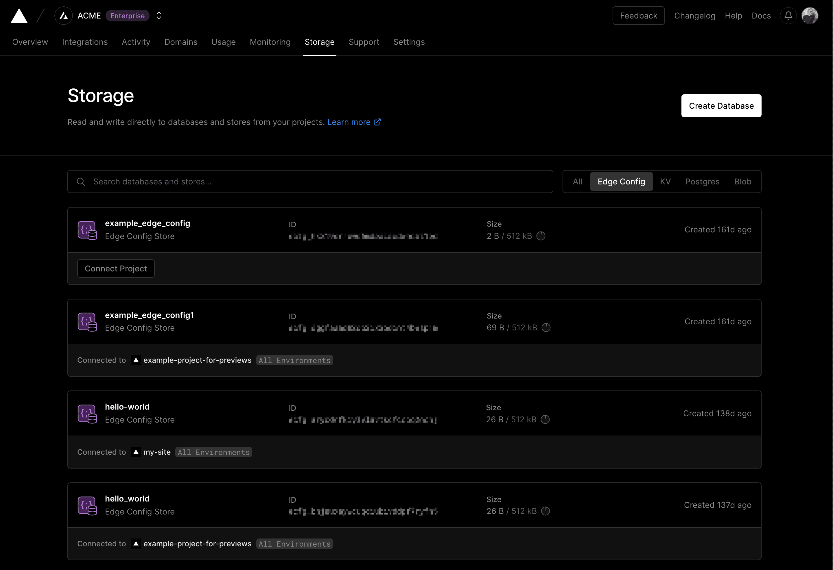 To view a list of all Edge Configs available in your Hobby team or team, go to Storage then select Edge Config from the drop-down after making sure that you are in the correct Hobby team or team.