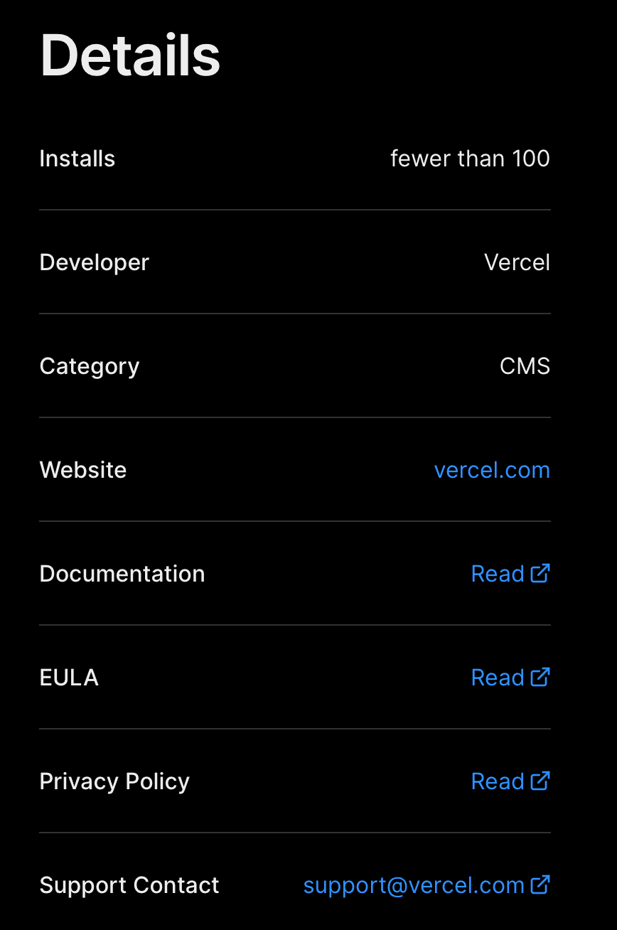 - Contact email: This is the contact email for the owner of the integration. It will not be publicly visible and will only be used by Vercel to contact you.