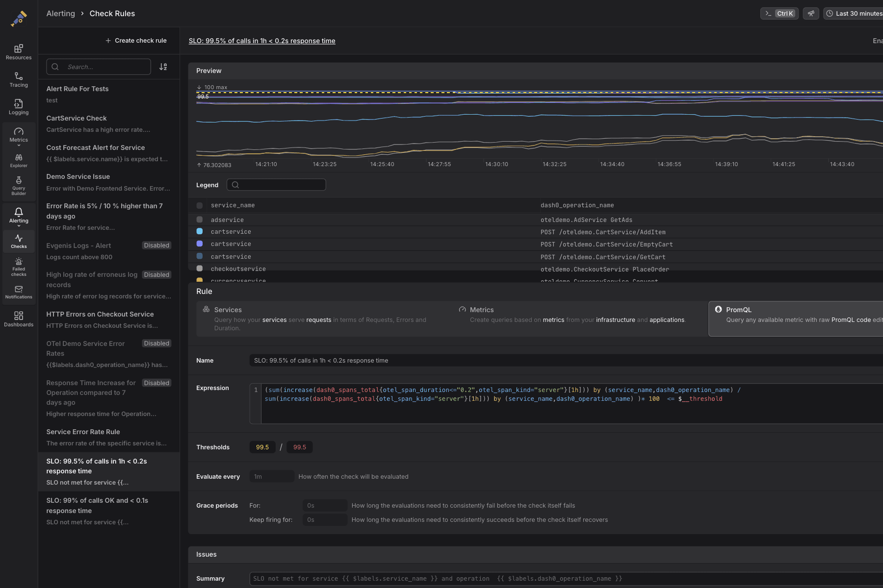 When the integration has been installed, logs from your Vercel projects will be sent automatically to Dash0. You can also enable tracing and metrics to gain further insights. Dash0 offers powerful customizable dashboards for your telemetry, alerting capabilities, as well as advanced filtering and analytics features. It also provides 30 days retention for logs and traces and all at a very competitive price.