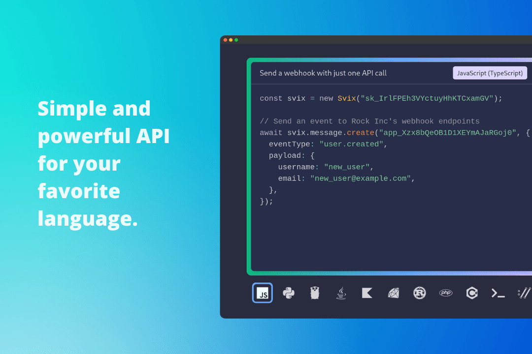 Svix is designed for developers. Our simple yet powerful webhook API provides you with everything you need to offer a world-class webhook experience.
